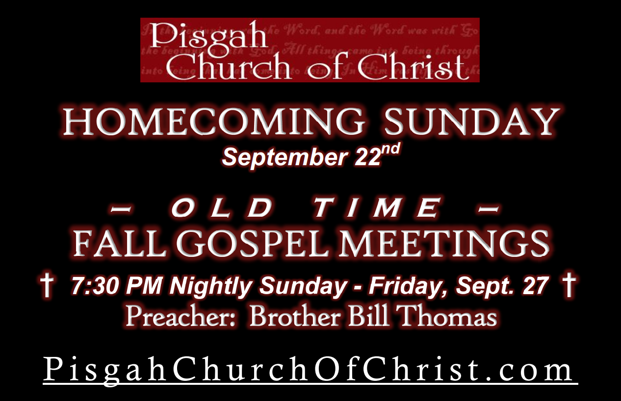 We cordially invite you to our worship services and Bible studies. It is our prayer that you will consider the Pisgah church of Christ. May God bless you!