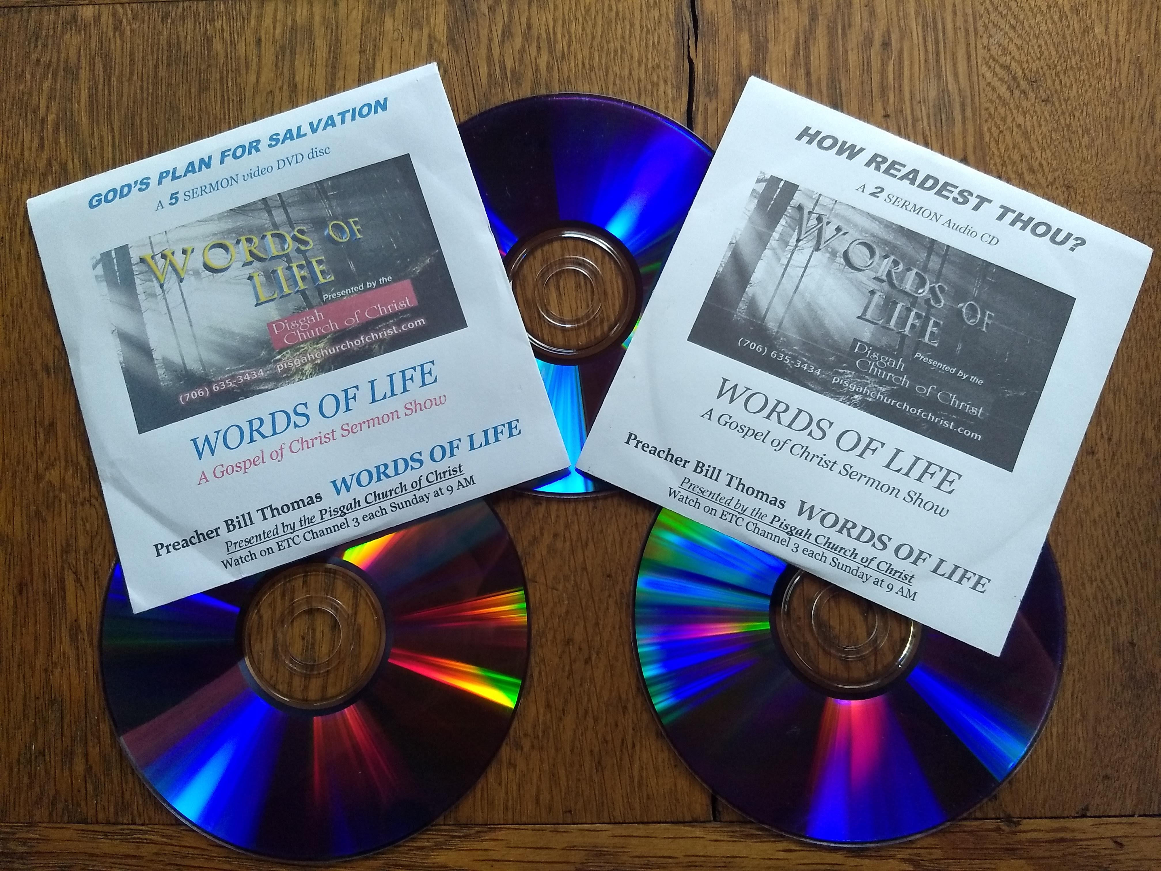 Free discs of Gospel preaching, including Brother James Sampson and Brother Bill Thomas' recorded Gospel sermons as well as prior episodes of the Words Of Life gospel sermon TV program are available upon request. These programs are available in standard Audio CD and Video DVD formats which will play in traditional players. Additionally these are available in .MP3 Audio and .MP4 Video formats on CD/DVD or internet download for use with computers, smartphones and digital music players. Just contact us to let us know which program episode or type of biblical subject in which you may be interested and we will mail you several sermons and/or shows on disc which will hopefully match your requested subjects and media choice(s). Also please feel free to kindly pass along the provided materials to anyone interested in everlasting life.